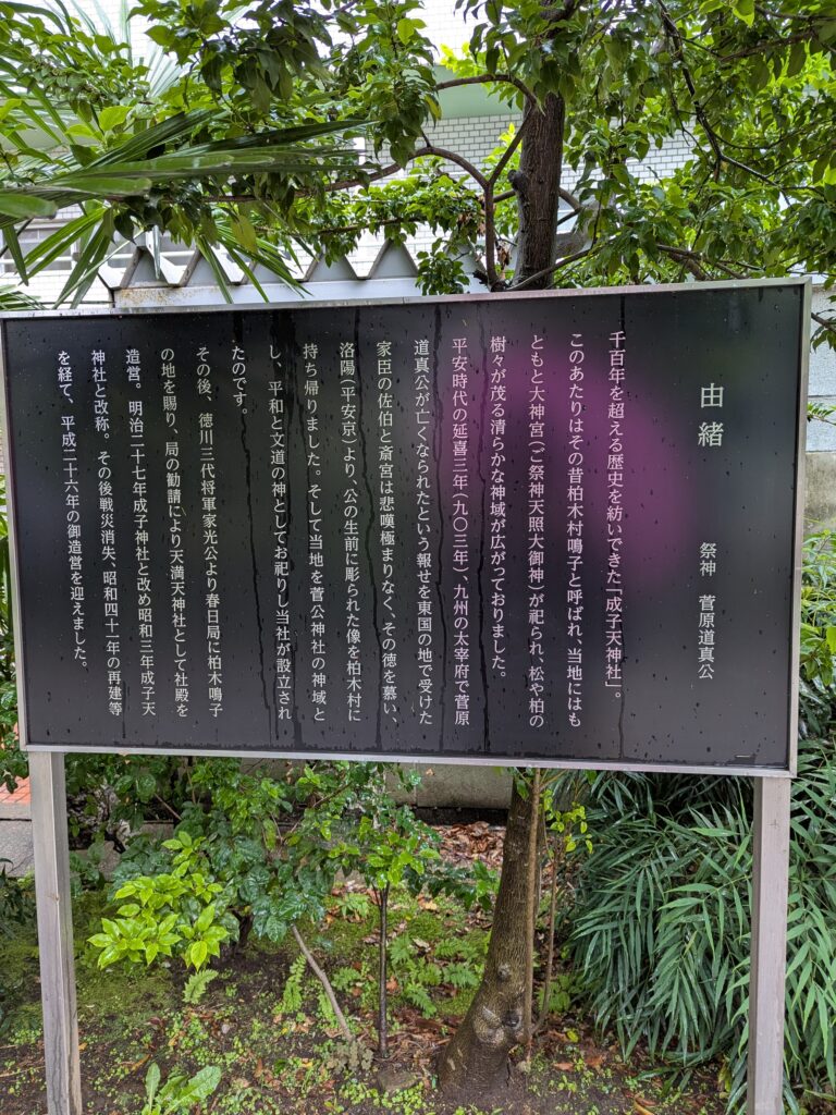 まずは千百年ほど前は、アマテラスを祀る神域だったそうで、903年に菅原道真公がなくなり、家臣の佐伯と斎宮がその徳を慕い、公の像を柏木村に持ち帰り祀ったことで後に家光公より柏木鳴子の地を賜り、天神社として社殿を創建した。