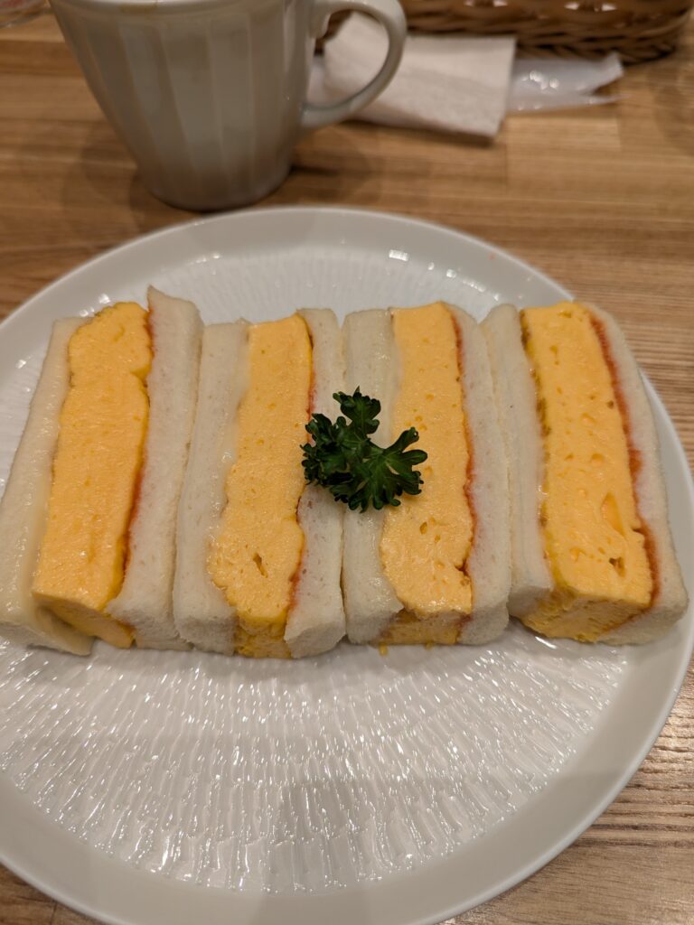 ランチは、タワープラザ1F「ペリカンカフェ」の注文後に焼き上げるふわふわオムレツサンド。墓地さんぽの先生お薦めの、ワープラザ1Fの「ペリカンカフェ」では、老舗パン屋「ペリカン」の食パンを使った、注文後に焼き上げるふわふわの「オムレツサンド」が人気だそうです。