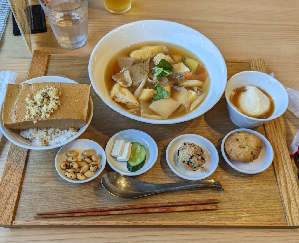 今日のラストは恵比寿に戻って、豆富食堂へ豆腐専門店というか豆腐工房が併設らしいランチの豆富御膳を頂きました。このごはんの上にのっている豆腐!!めっちゃご飯にあいます。醤油味の豆腐の上に揚げしょうがと山椒がおいしい。大豆の味を楽しめるゆで大豆?ひじきとおからやがんも。お出汁の椀物も絹のようなおぼろ豆腐?もおいしかったです。豆腐好きの私としては大満足!!お腹も大満足!!