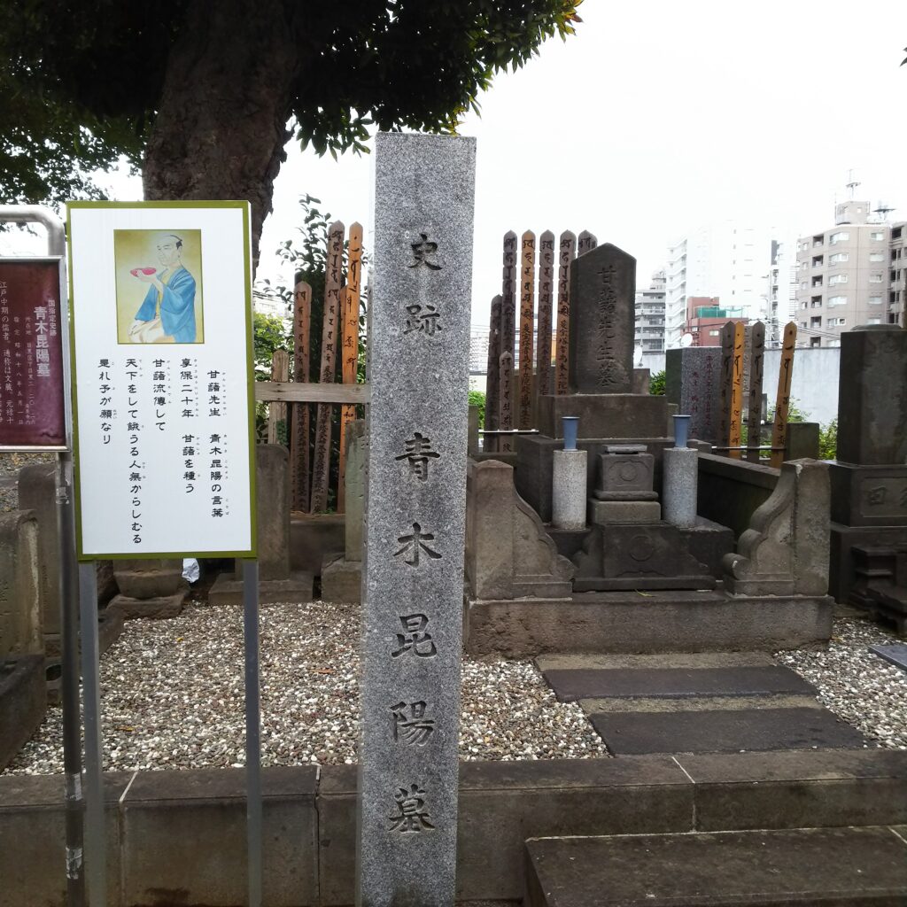 目黒不動尊の裏手にあったのは、青木昆陽(あおき こんよう 甘藷先生かんしょせんせい)の墓所でした。サツマイモの普及をした人で、先生曰く、この人物がサツマイモを普及しなければ、戦中戦後のの日本人は生きていけなかったのでは?というくらい戦中もサツマイモでしのいできたということです。イモは嫌い!という年輩者も多いですよね。ですが、このサツマイモは今やデザートにもなるほど、進化していますものね。甘藷先生に感謝。