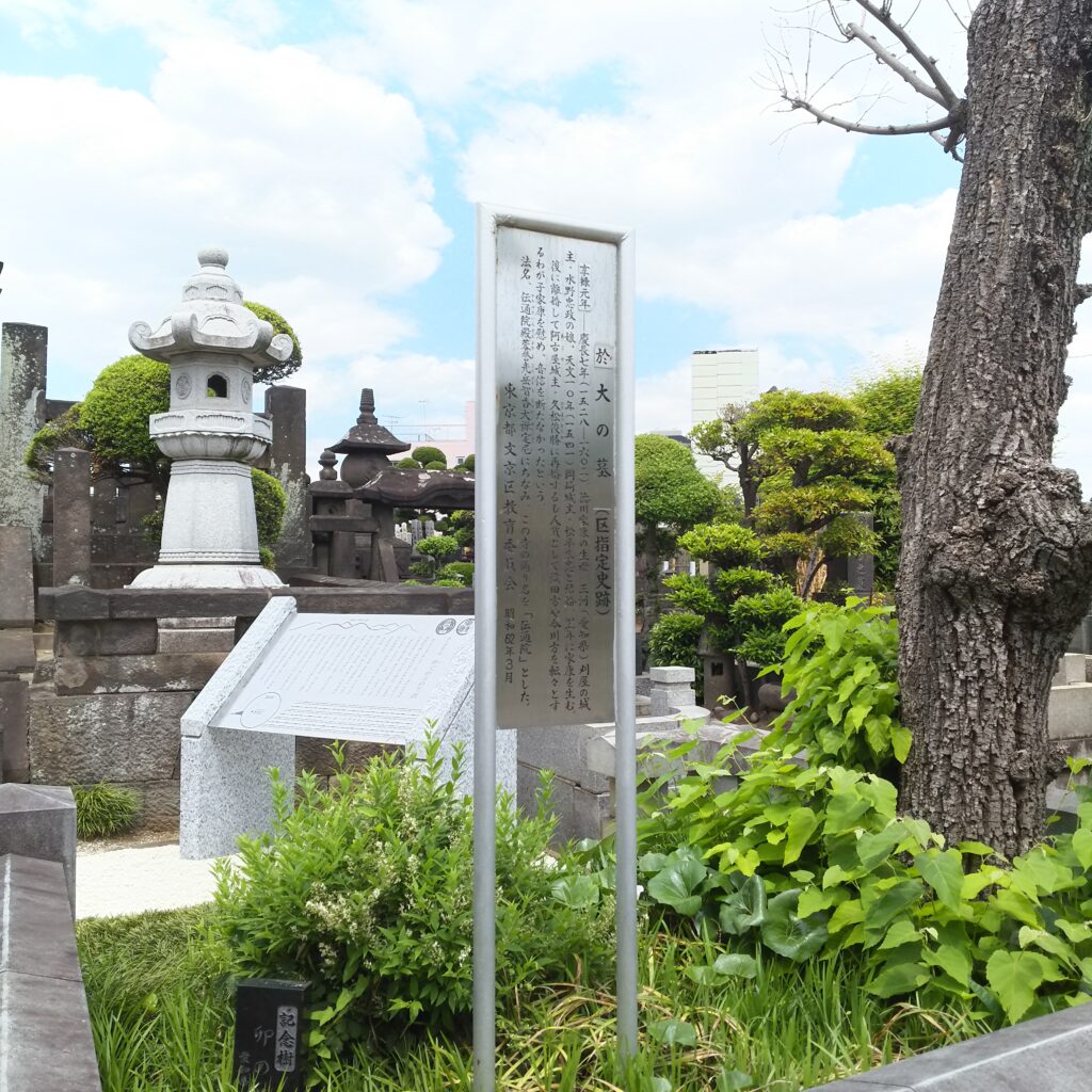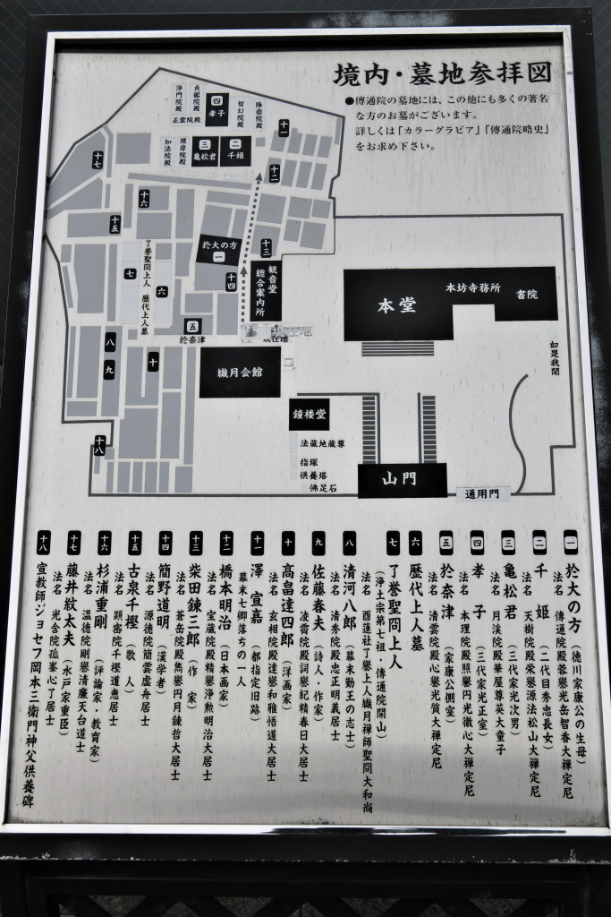 徳川家子女などのお墓がある。家康の生母、於大の方の墓所があり、彼女の法名「傳通院殿」にちなんで、院号とした。主な著名人の墓は以下(写真)の通りである。もっと詳しく書くべきなのだが、写真がなく一部に限られるのでご容赦願いたい。