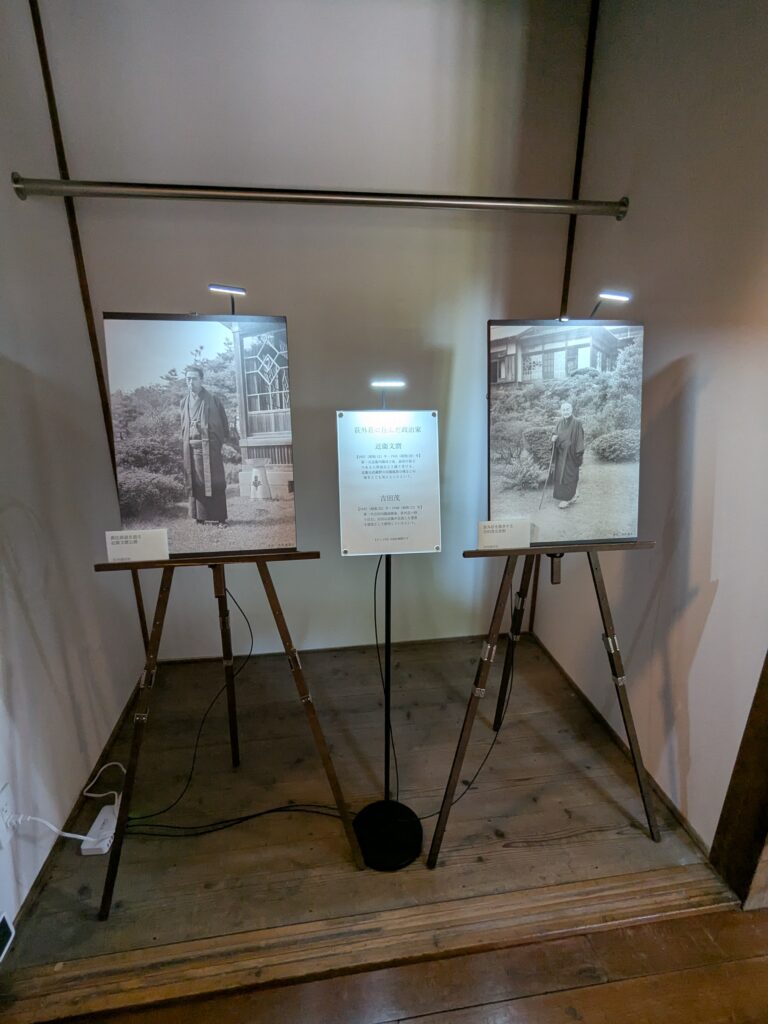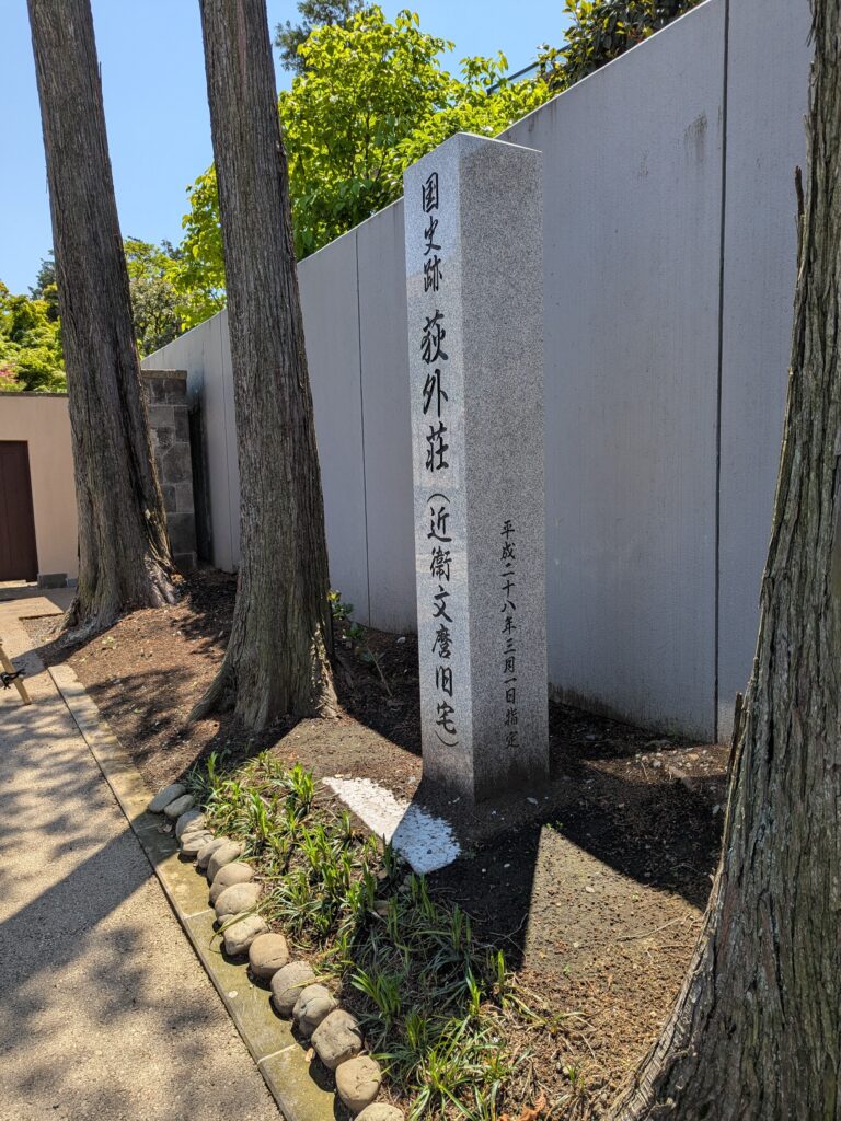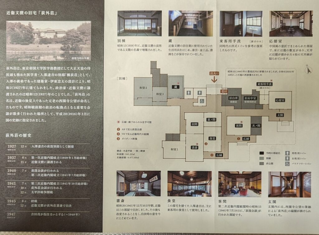 荻外荘(てきがいそう)は、昭和2年に伊藤忠太の設計で建てられました。当初は、大正天皇の侍医頭も務めた入澤達吉の別邸でした。昭和12年に近衛文麿に譲渡されたものです。また戦後、吉田茂が少しの間仮住まいしていたようです。
